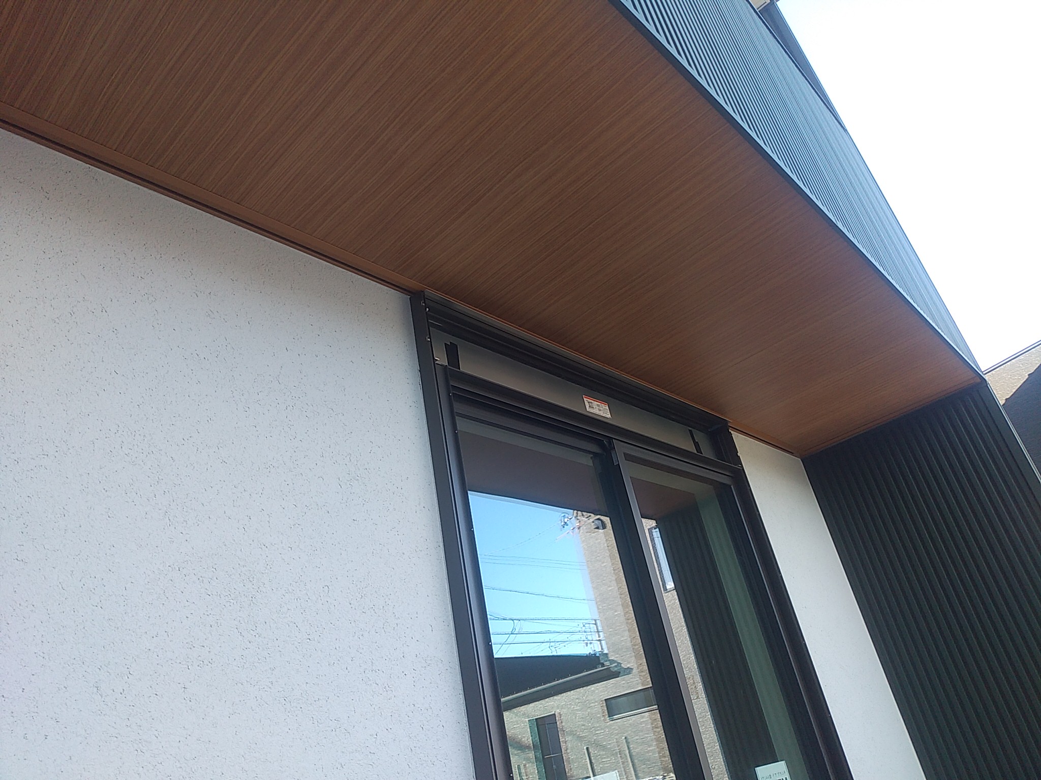 こちらは12月中旬の写真。真っ白なラップサイディングがパッと明るく、そこに爽やかなブルーのドアや、レッドシーダーの軒天が鮮やかなコントラストを描きます。