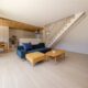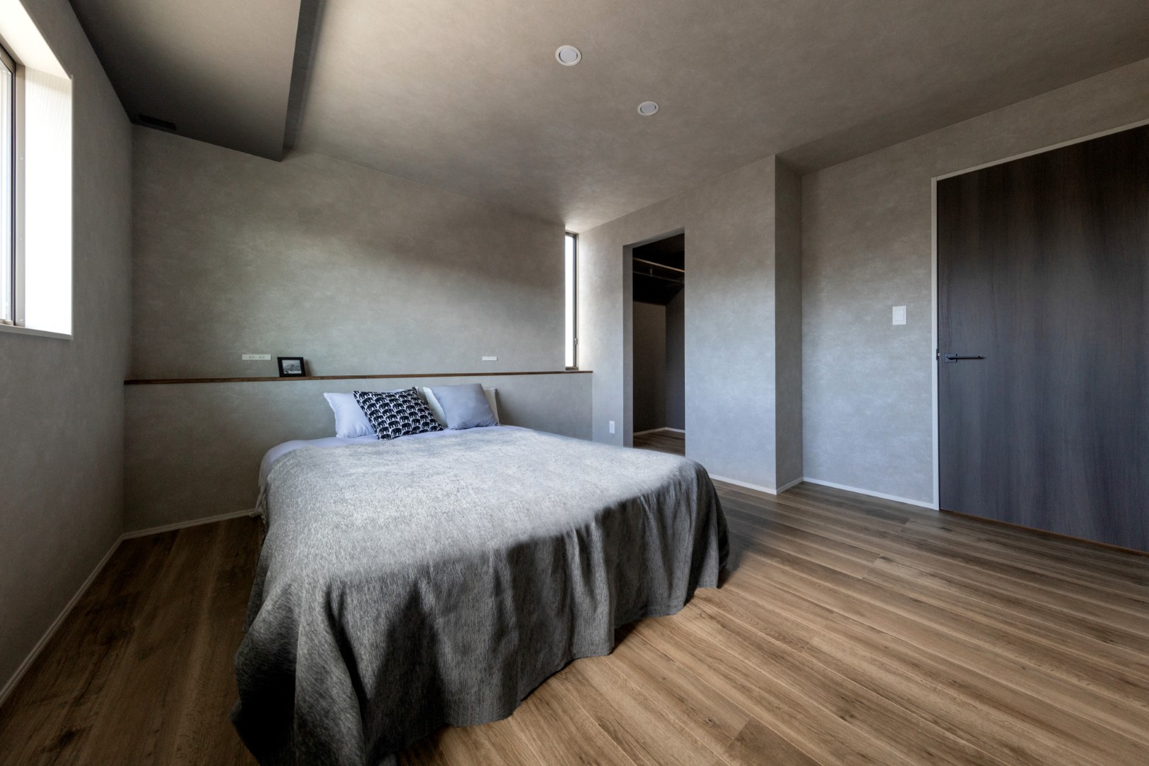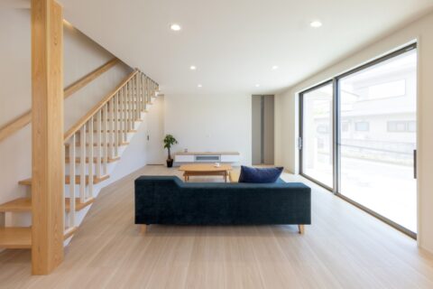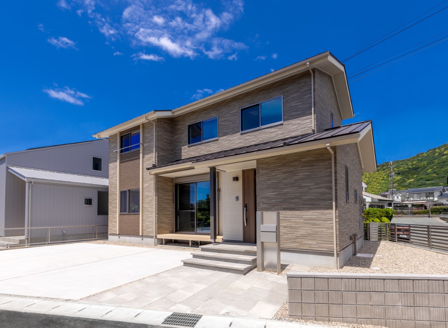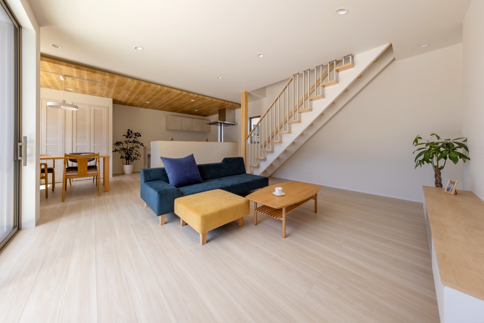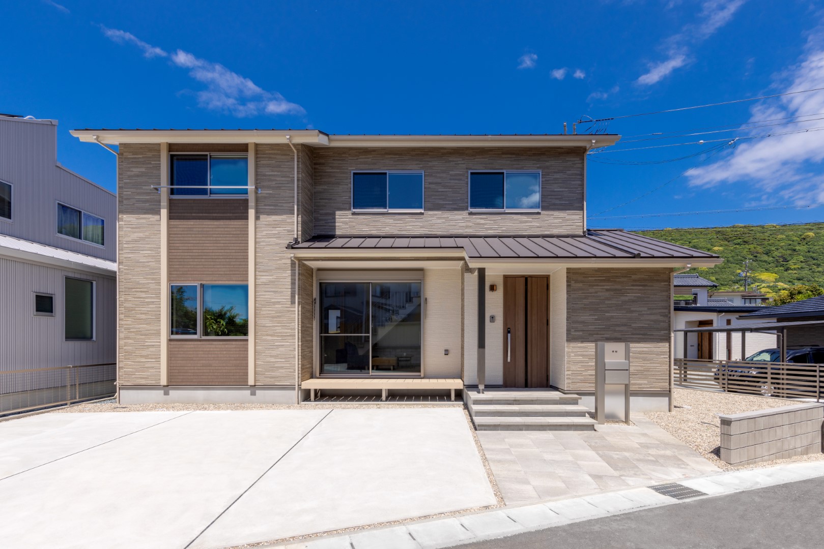 蔵王山も程近い、田原の住宅街に建つ約32坪の住まい。建物をゆったりと包む切妻屋根、外壁面には上質な石目調の素材を採用し、穏やかで重厚感のあるファサードが目を引きます。1階は回遊性のある間取りを実現すると共に、すっきりとしたデザインにこだわりました。建具は天井いっぱいのハイドア、リビング内に配した階段も視線が奥まで抜けるスケルトン仕様で、のびやかな雰囲気が部屋全体に広がっています。WIC、土間収納、ランドリーコーナーは動線を考慮しながら広めに確保。限られた条件の中でも、快適な暮らしが叶う、ゆとりある住まいが完成しました。