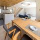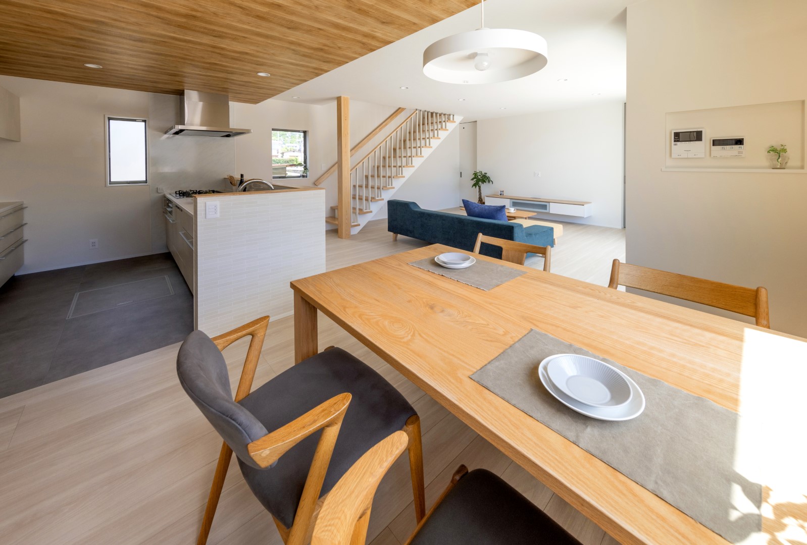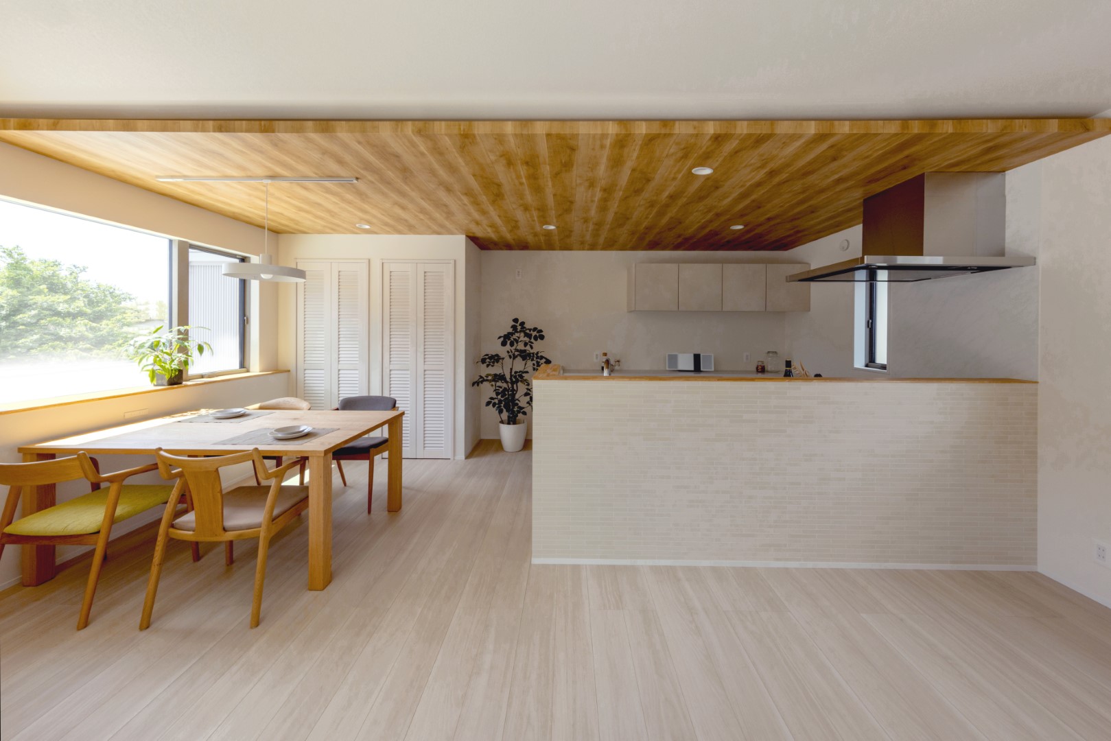 キッチン・ダイニングの上部は天井のデザインを切替えほどよくゾーニング。天井が少し下がると、包み込まれるような安心感のあるスペースになります。アクセントに木目のクロスを選んで温かみのある空間を実現しました。
