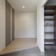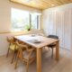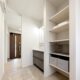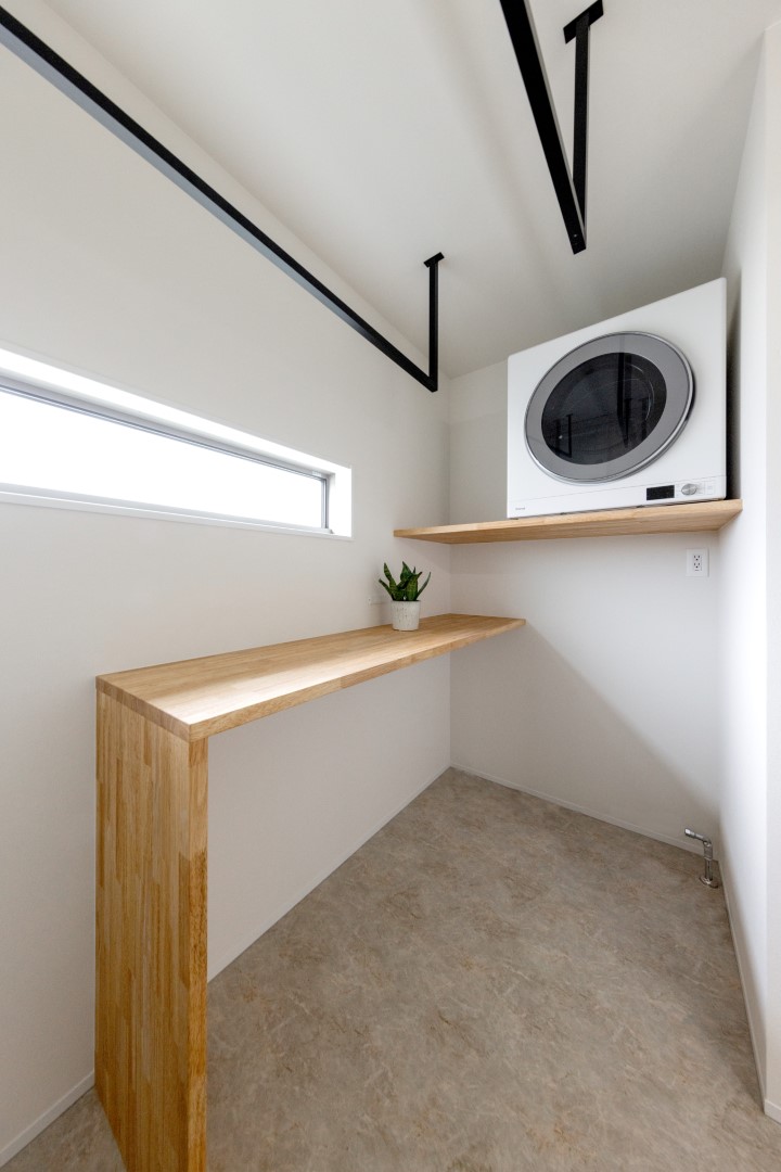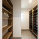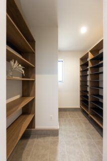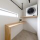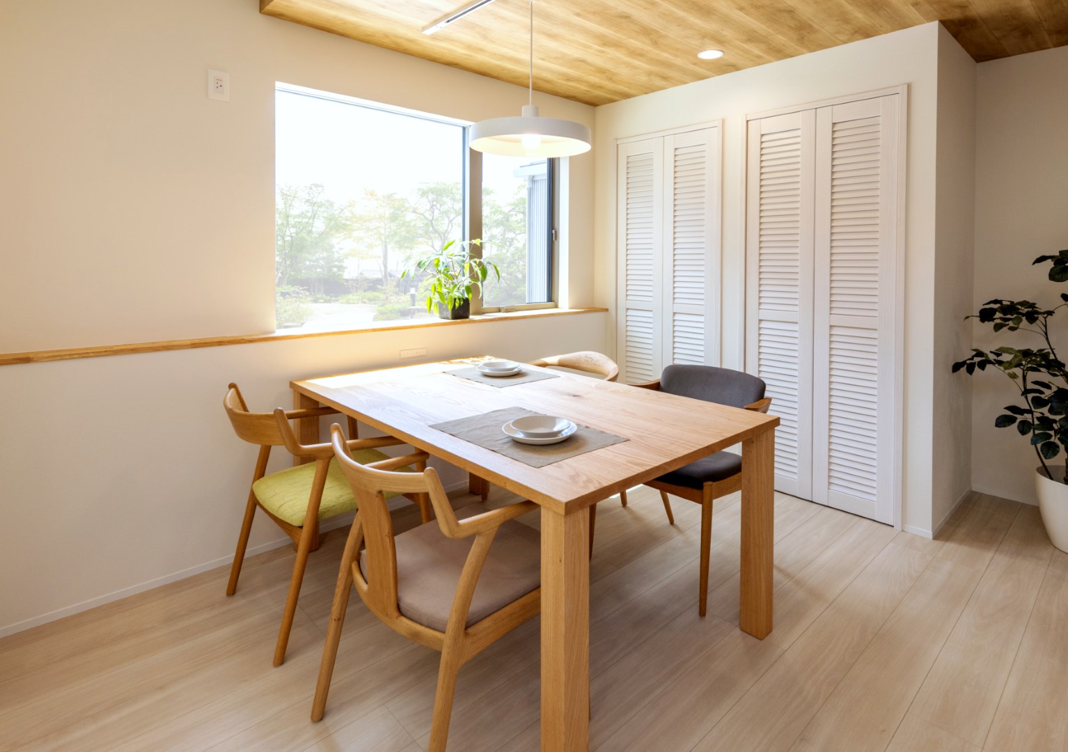 ダイニング背面には、パントリー兼LDK収納をレイアウト。白のルーバー扉を採用して通風性も◎。ルーバーがあることで、インテリアにもやわらかな雰囲気がプラスされました。窓辺にはカウンター状の窓台を延ばし、壁際ののっぺり感を回避。すらりとしたラインデザインがダイニングコーナーを引き締めるアクセントになっています。