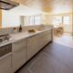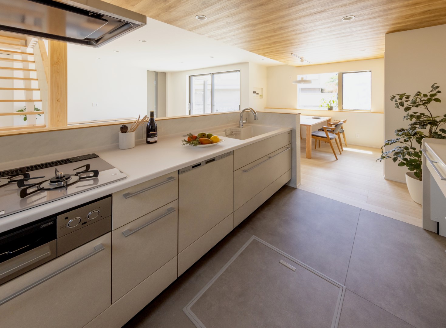 キッチン床はフロアタイル貼。濃い目のモルタルデザインなので汚れが目立ちにくいのもポイント。手元カウンター壁は少し立ち上げて、作業中の手元がリビング側からは見えないようにしています。階段が正面にありますが、先まで見通せるスケルトン仕様なのでお子さんが小さいうちも安心して家事をすることができます。