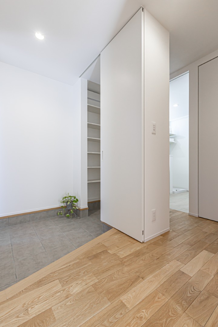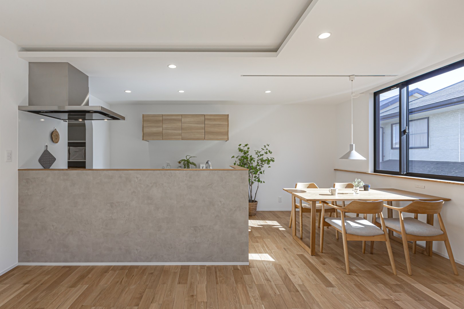 シンプルな白壁に黒サッシが映えるモダンな外観。玄関を入ると、斜め框が奥行きを演出する広いホールが広がります。リビングには上質な無垢ナラのフローリングを採用。フラットに繋がるテラスデッキはフェンス付きで、外からの視線を気にせず開放的な時間を過ごせます。