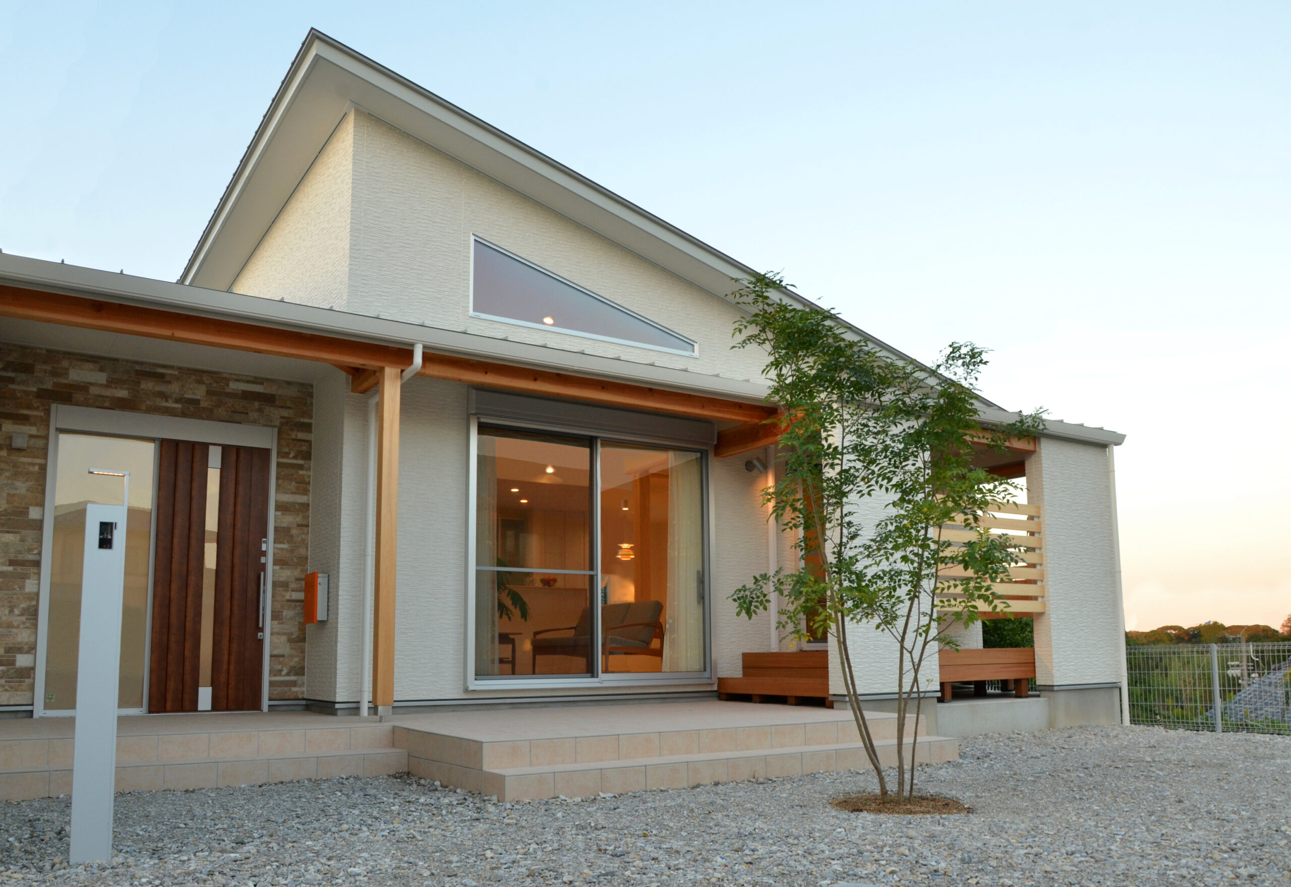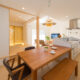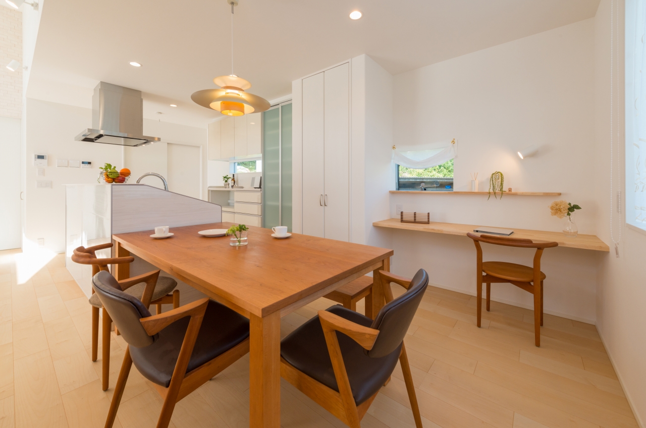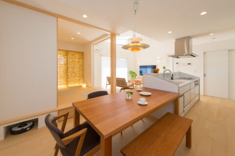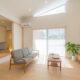 個性的な三角形の高窓から注ぐ自然光が天井の傾斜をよりきわだたせ、旧来の平屋のイメージを払しょくする、明るさと開放感が自慢の空間となりました。