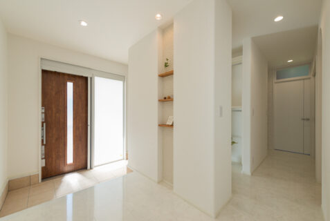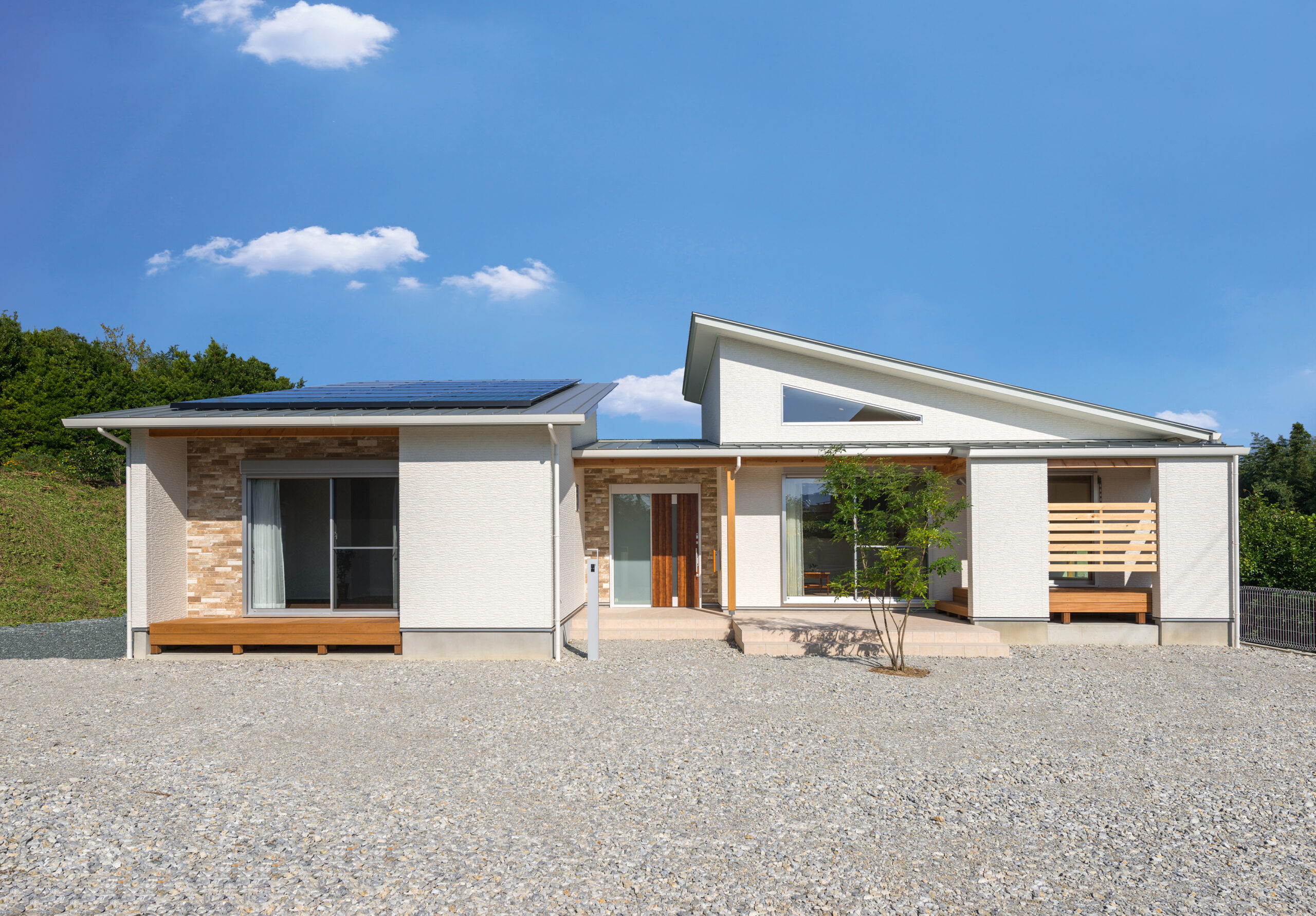 3枚の屋根と石目調サイディングがアクセントになった外観は、直線を意識したシャープなデザインですっきりとした表情に仕上げています。