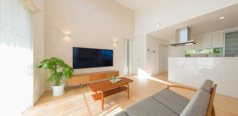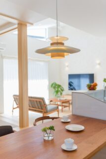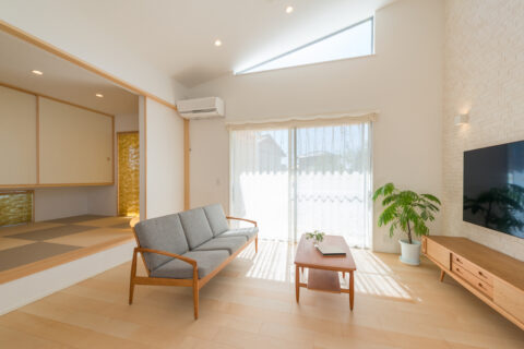 家族が集うリビングは、屋根の形状から生まれる高さ4mの勾配天井を活かし視線がすっと抜ける広々とした空間設計です。