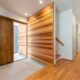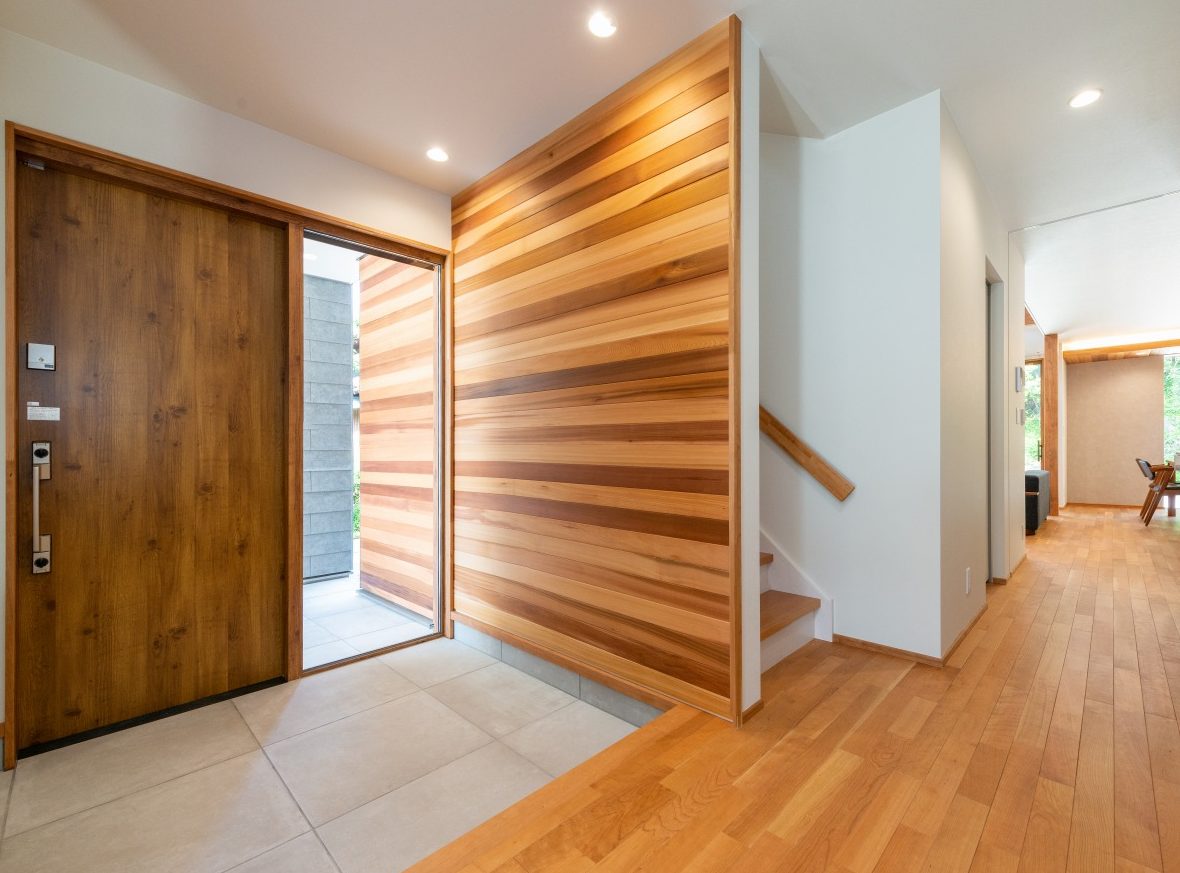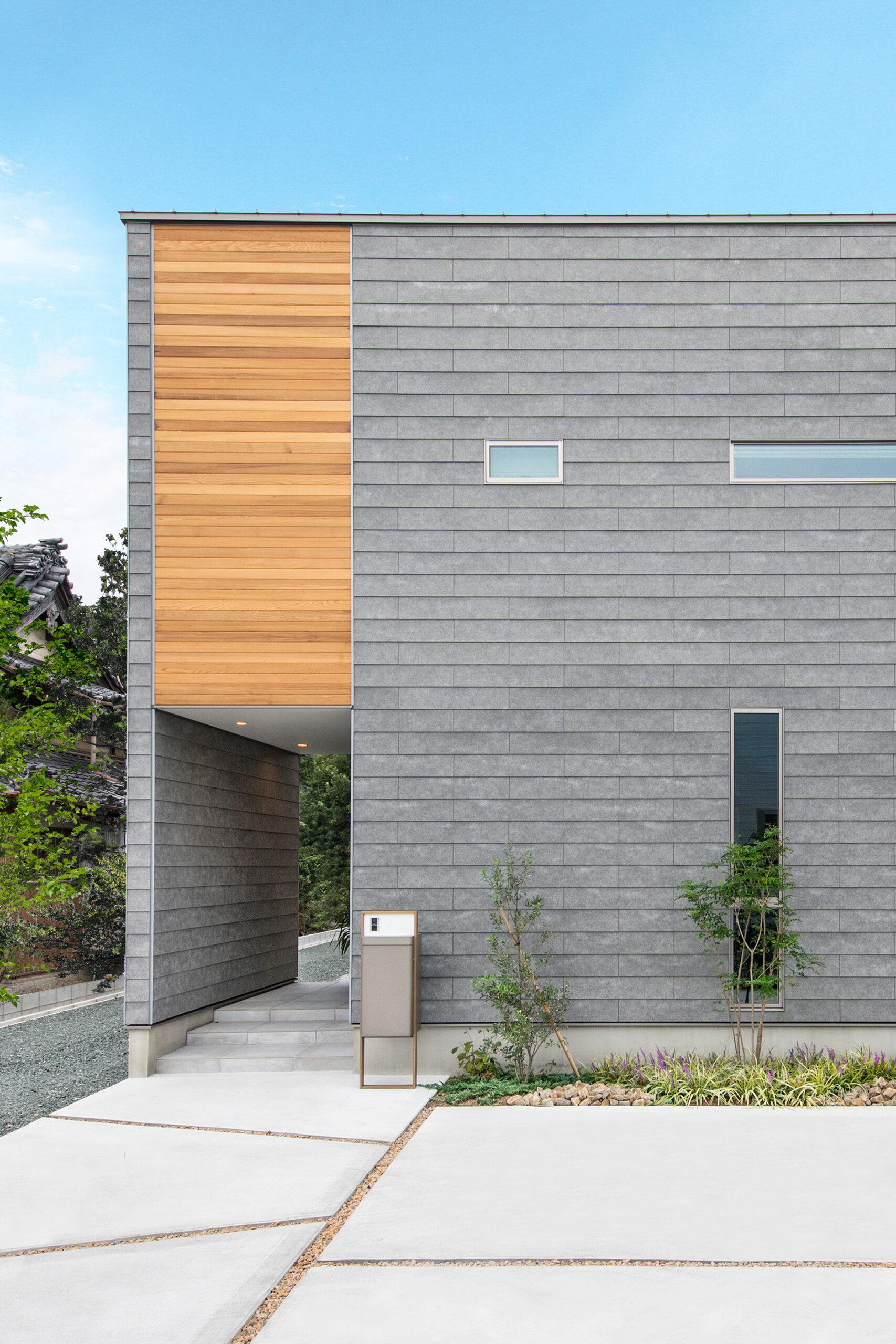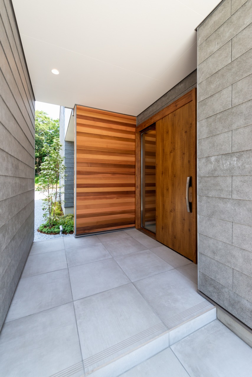 外観のラップサイディングは1枚1枚表情の違う天然素材で、無垢フローリングと同じく、経年変化する自然の風合いも楽しい逸品。正面上部には、レッドシダー材を配し、静かな景観にほどよいリズムを加えました。