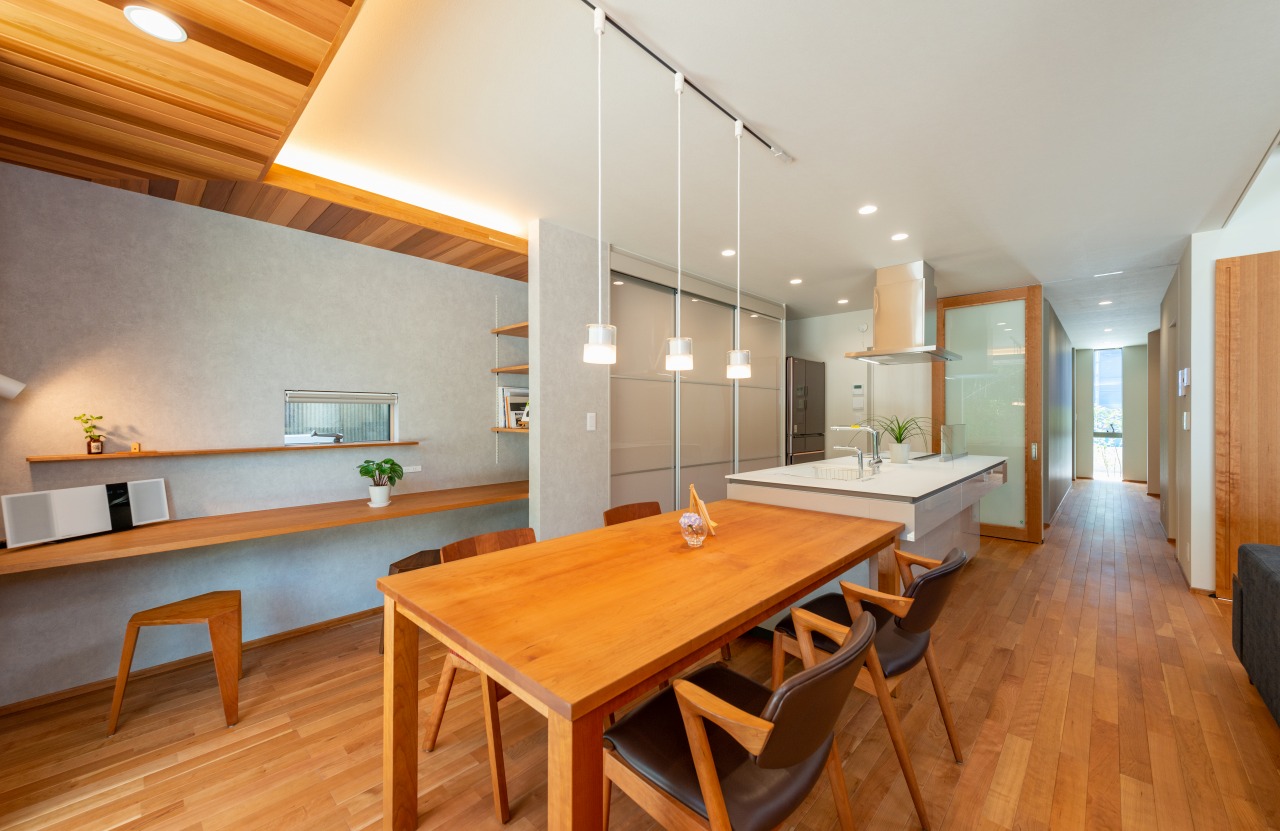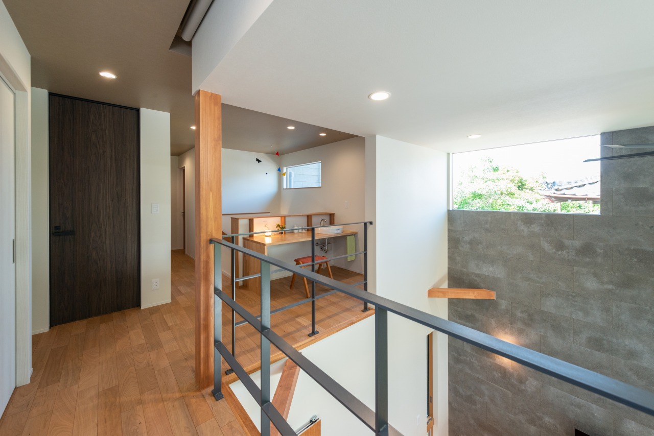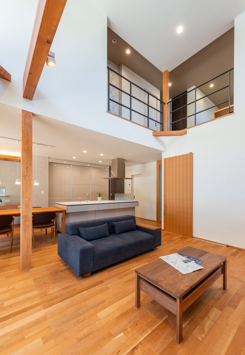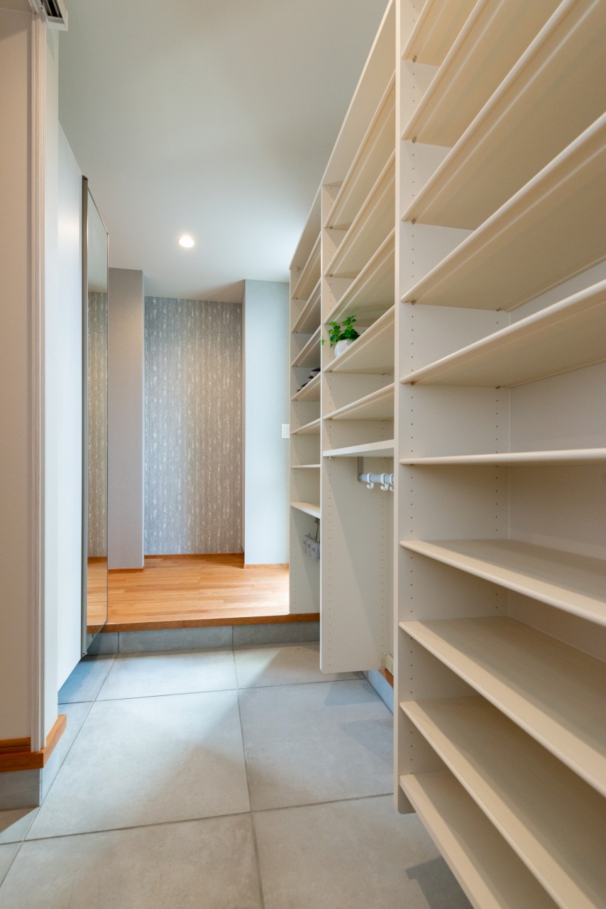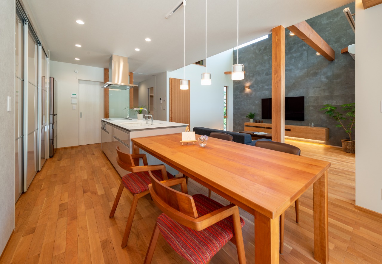 「掃除や片付けが楽になる工夫が欲しい」という奥様のご要望で、室内にはハンガーにかけた洗濯物を畳まずにしまえるクローゼットや、汚れを分解する除菌水が出る水栓(キッチン/バス/洗面)なども備え、暮らしの快適面もしっかりサポート。家族全員が時間に追われず、すっきりスマートに暮らせる住まいとなっています。