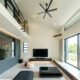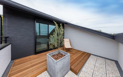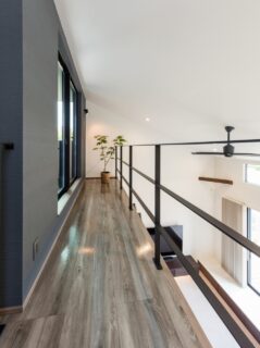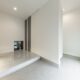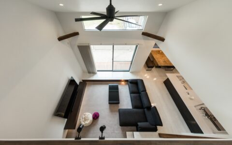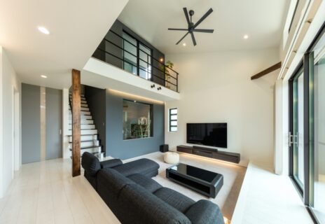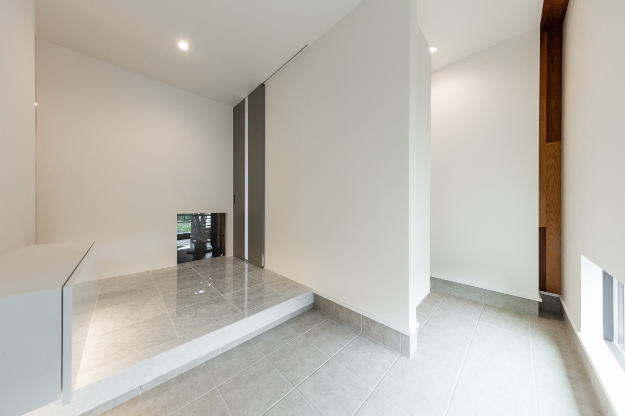 暮らしの中心となる吹抜リビングは、ほかの部分よりも一段低く沈み込んだ空間。『サンクンリビング』と呼ばれる特別な意匠となっています。外観、内観のカラーコーディネートはホワイト・ブラックメインに、優しさやエレガントさを引き出したい場面では、淡いグレー色を採用。アーバンライクな中にも穏やかさが宿るスタイルを大切にしました。
