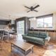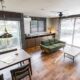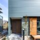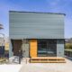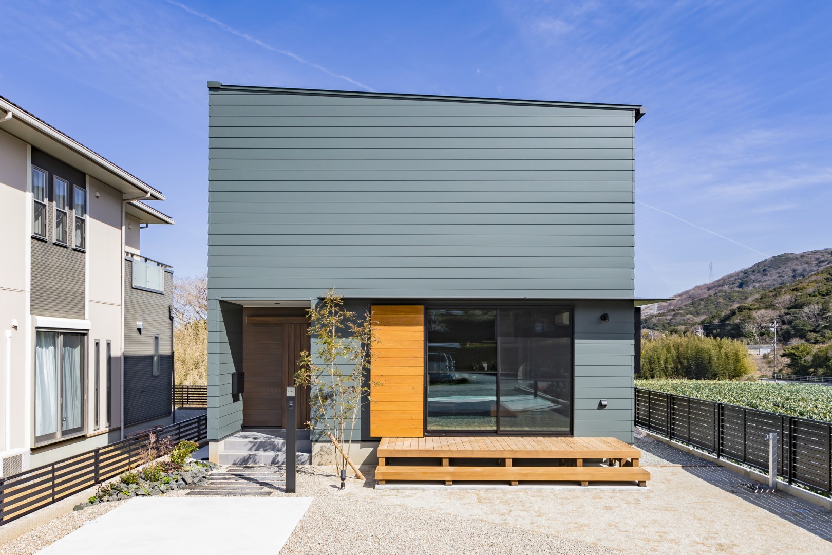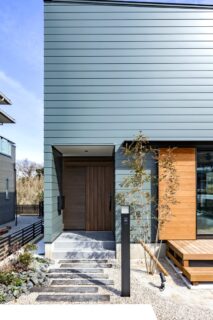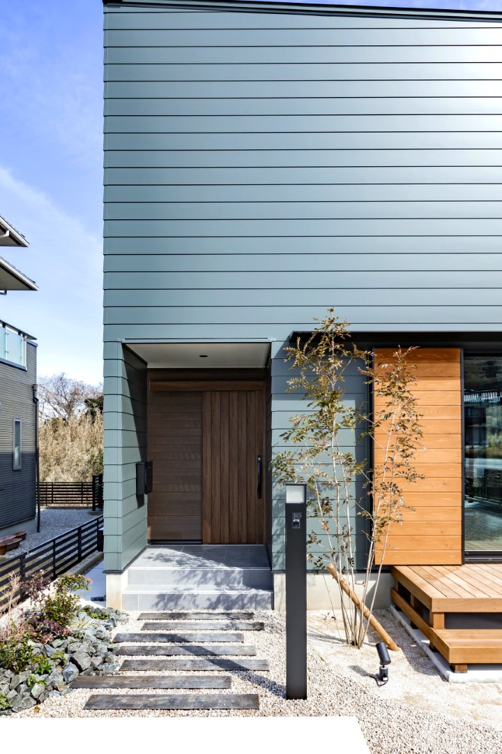 K様邸の外壁は絶妙なグリーンが目を引く、ラップサイディング風の金属サイディング。玄関を入るとお施主様のご希望だった黒いアイアンのオープン階段が出迎えます。