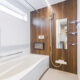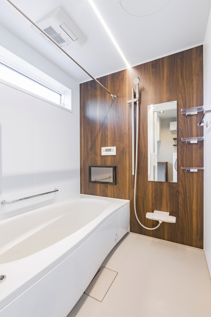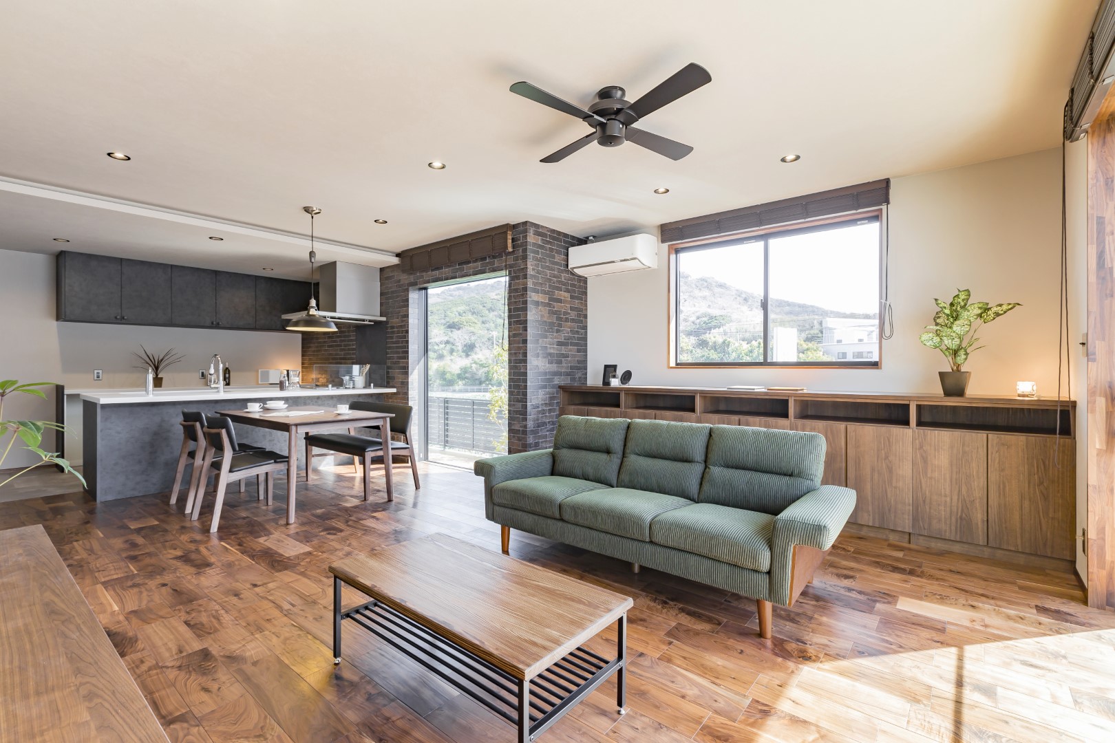 1Fは全室にウォルナットの無垢フロアを使用することで、落ち着いた大人の空間を演出。LDKの壁には釉薬の質感豊かなウォールタイルも張り込み、世界で一つだけのデザインとなっています。