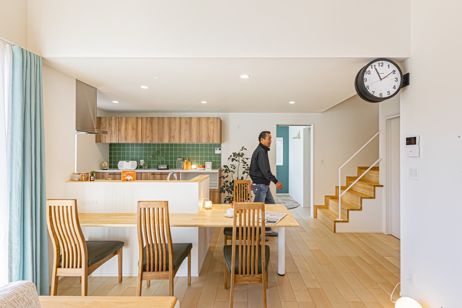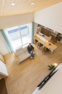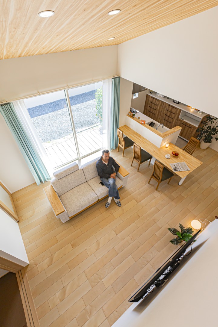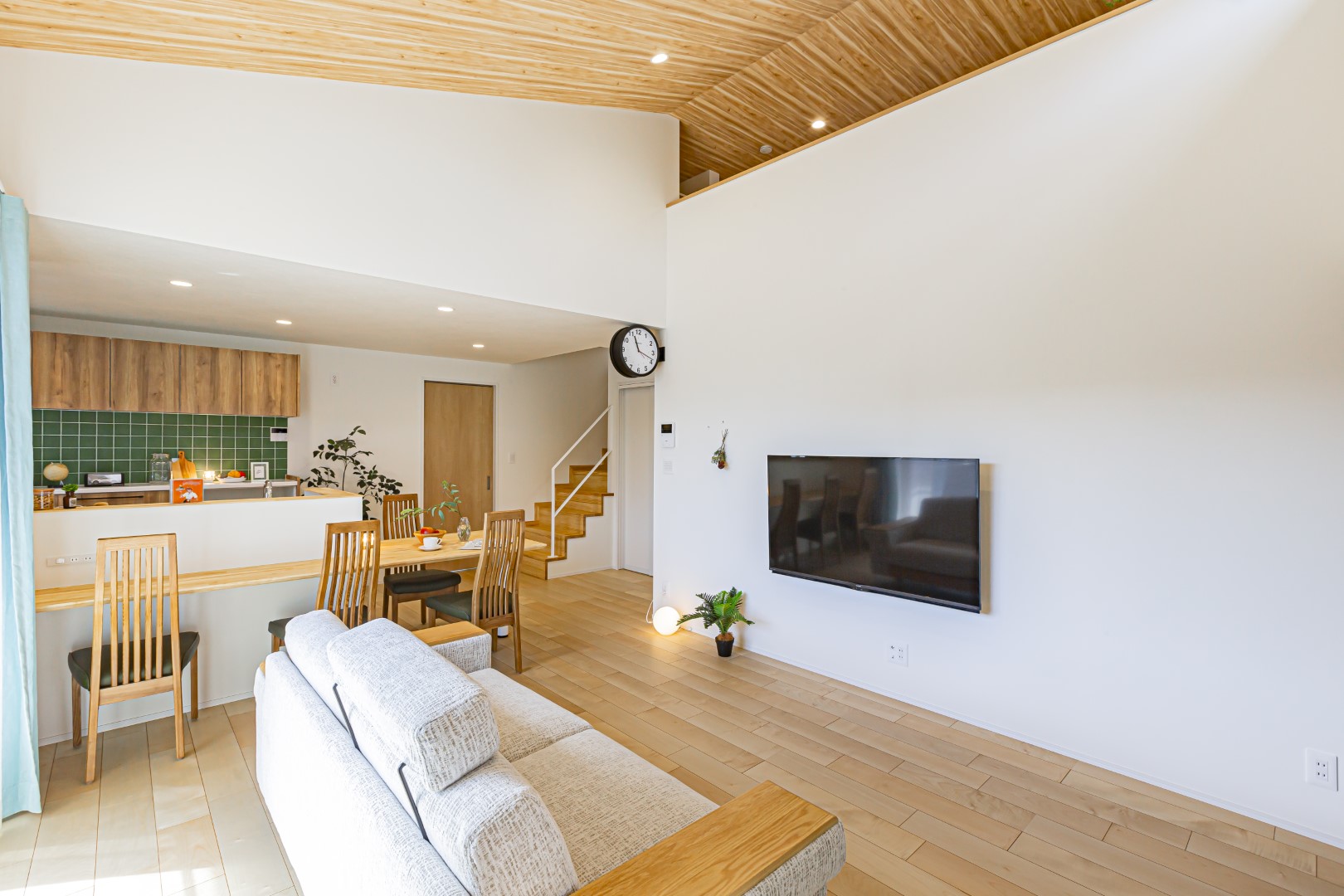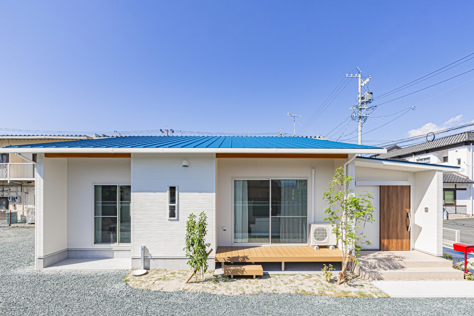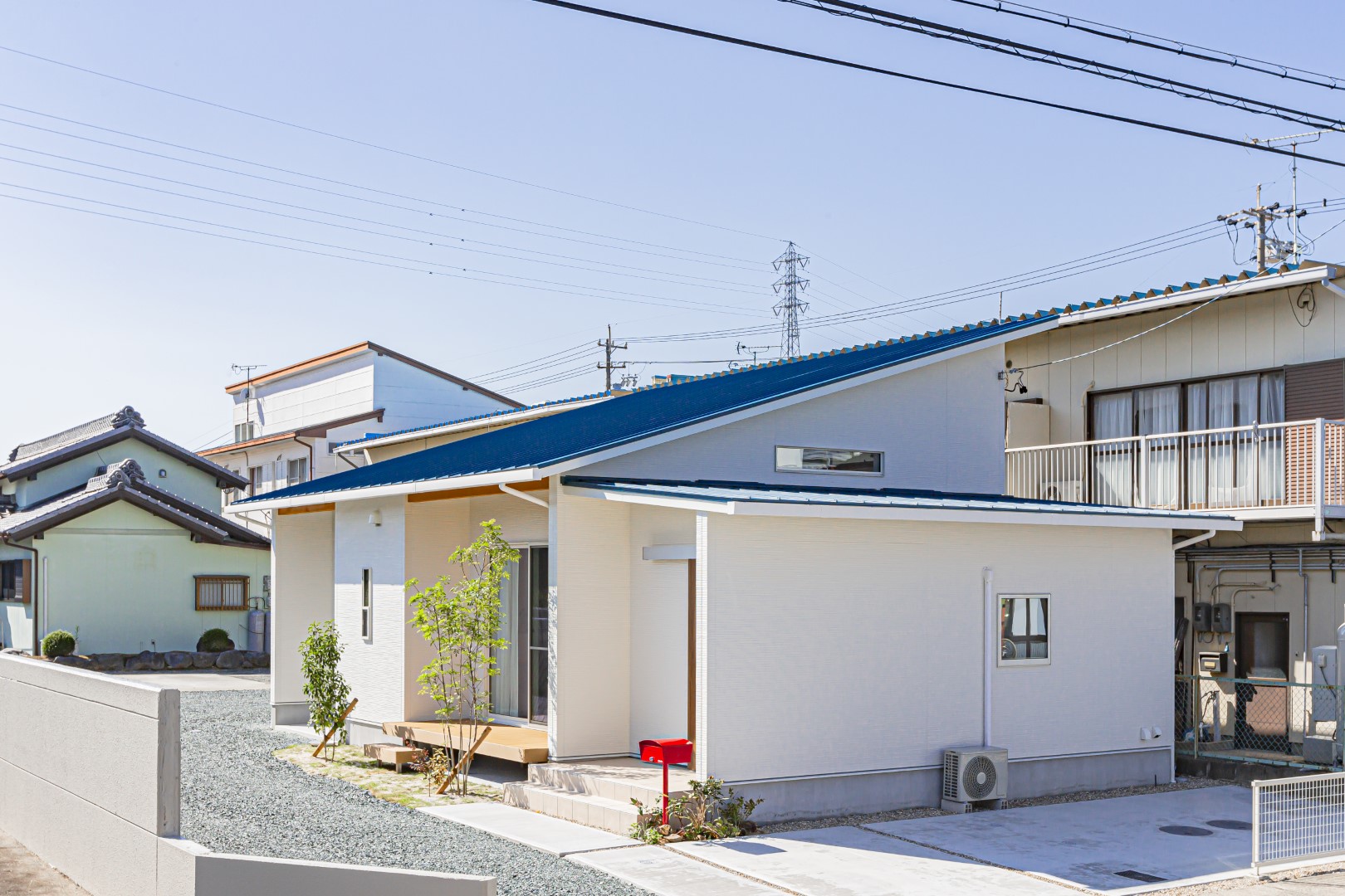 白い外壁に青い屋根が映える爽やかな外観のO様邸。リビングは勾配屋根を活かした高天井で、縦の空間を最大限活用。プロジェクターを使って映画鑑賞ができるロフトスペースも備え、伸びやかで開放的な住空間を実現しました。室内すべてバリアフリー仕様にて設計。リビングとフラットに繋がるモダンな和室は、襖を閉じればゲストルームとしても利用でき、誰もが快適に過ごせる工夫が各所に詰まったプランとなっています。造作のキッチンカウンターや、お気に入りのシューズを見せるオープン収納などお施主様のご要望に合わせた家具、収納をオリジナルで造作。 空間にピタッ!と収まる、使い勝手の良さと、一体感のあるデザインも魅力です。