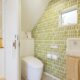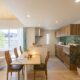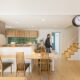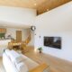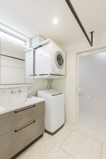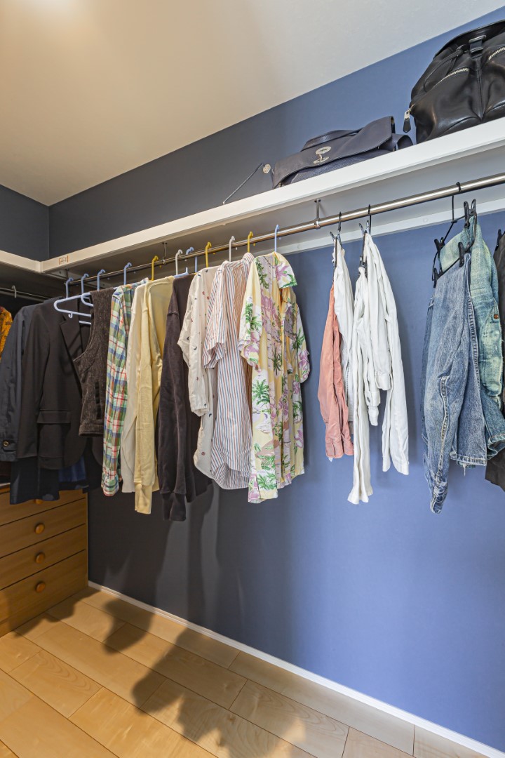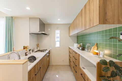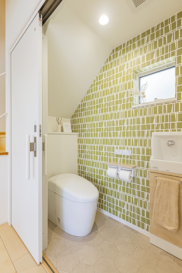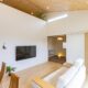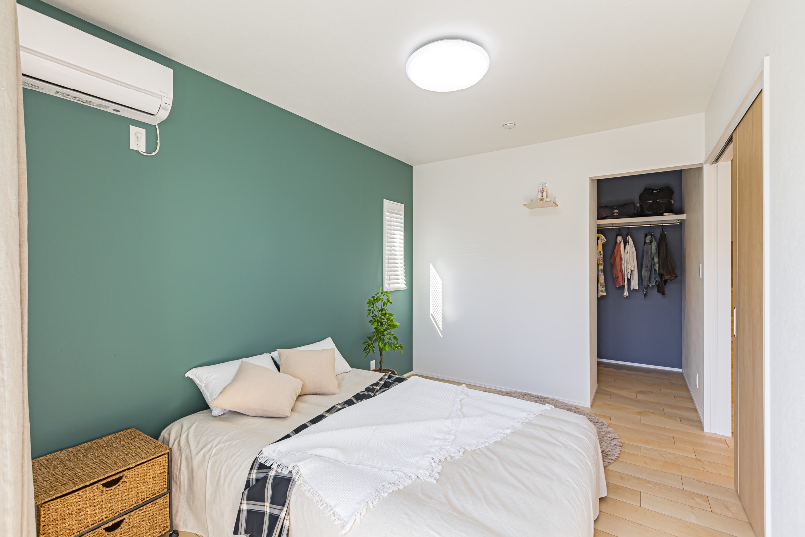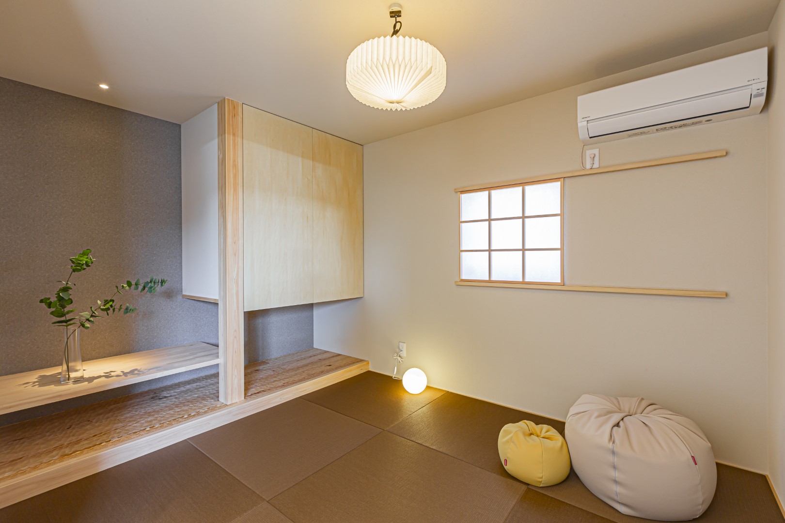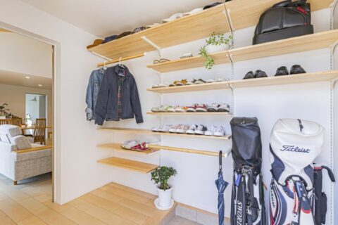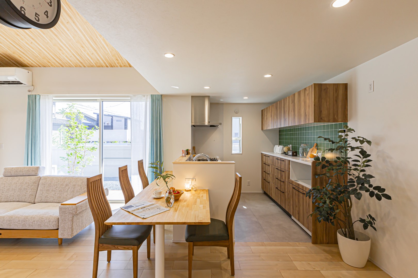 白い外壁に青い屋根が映える爽やかな外観のO様邸。リビングは勾配屋根を活かした高天井で、縦の空間を最大限活用。プロジェクターを使って映画鑑賞ができるロフトスペースも備え、伸びやかで開放的な住空間を実現しました。室内すべてバリアフリー仕様にて設計。リビングとフラットに繋がるモダンな和室は、襖を閉じればゲストルームとしても利用でき、誰もが快適に過ごせる工夫が各所に詰まったプランとなっています。造作のキッチンカウンターや、お気に入りのシューズを見せるオープン収納などお施主様のご要望に合わせた家具、収納をオリジナルで造作。 空間にピタッ!と収まる、使い勝手の良さと、一体感のあるデザインも魅力です。