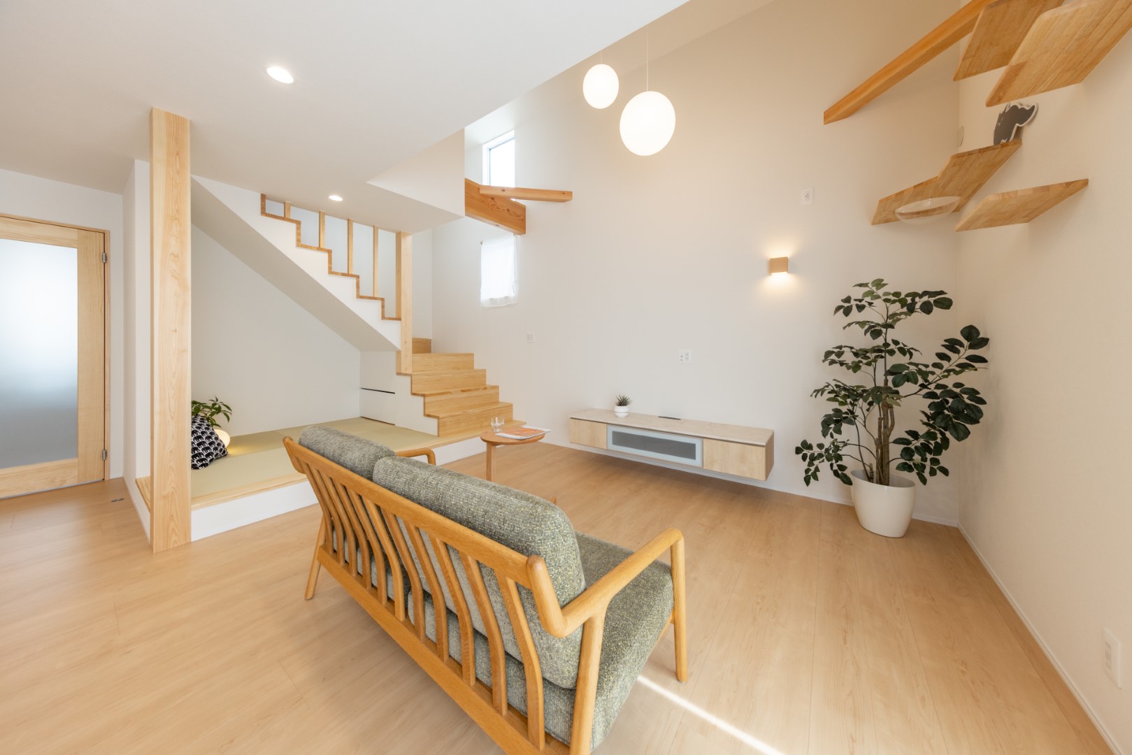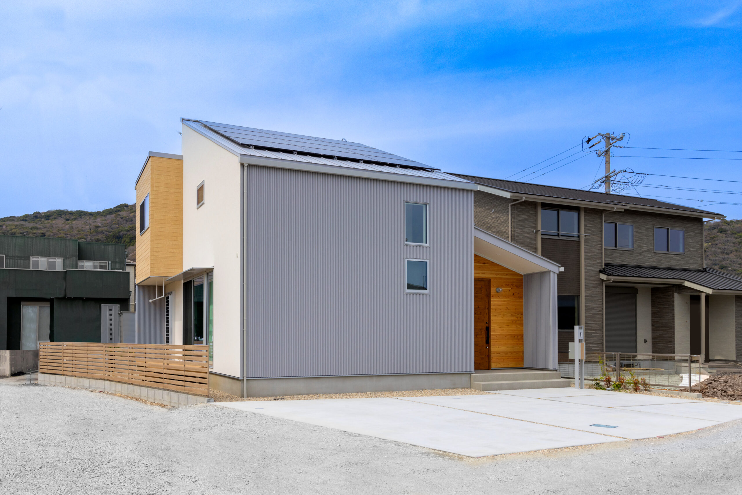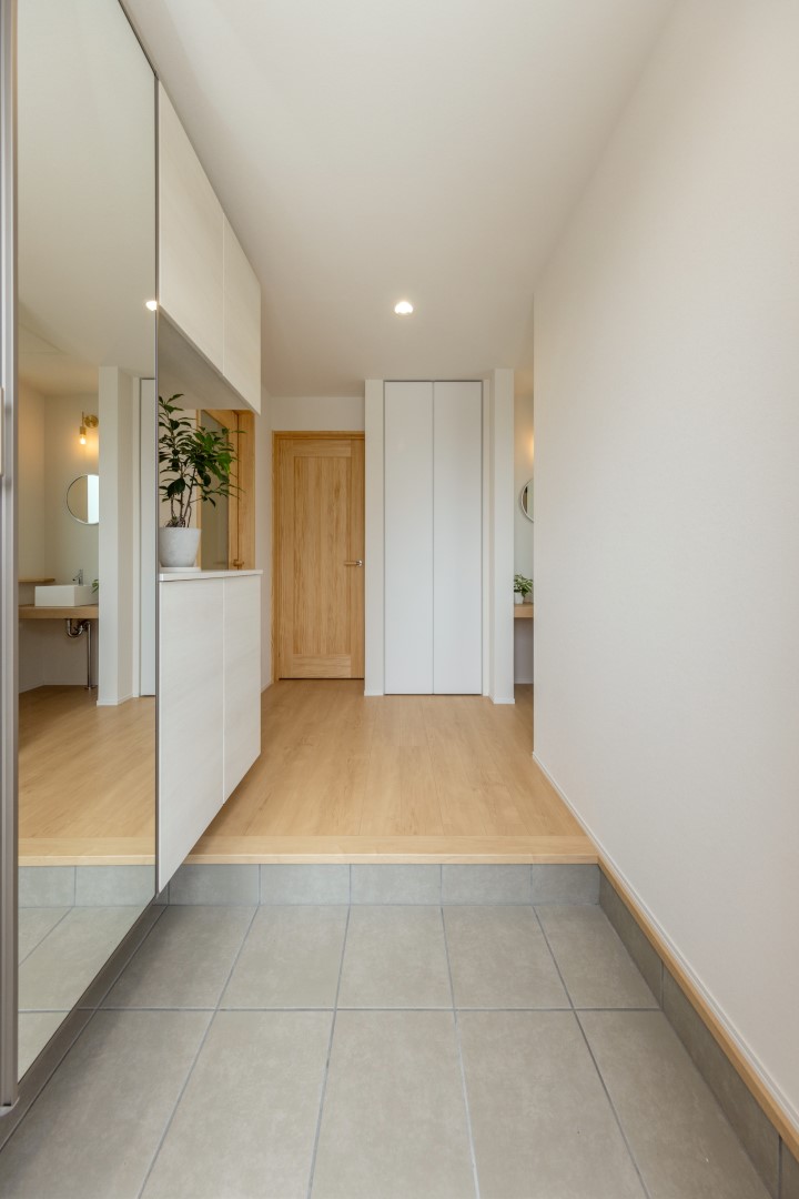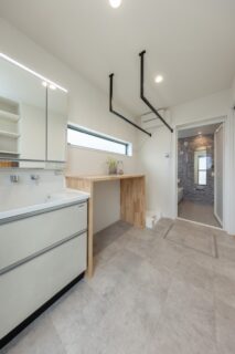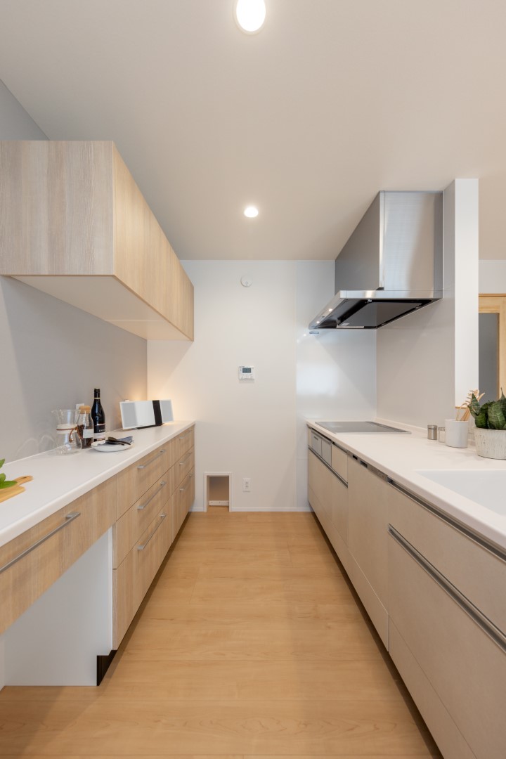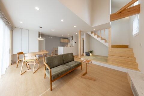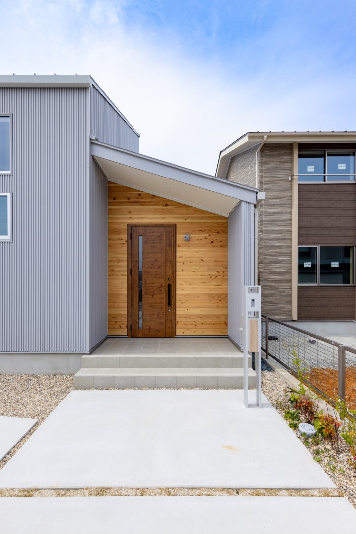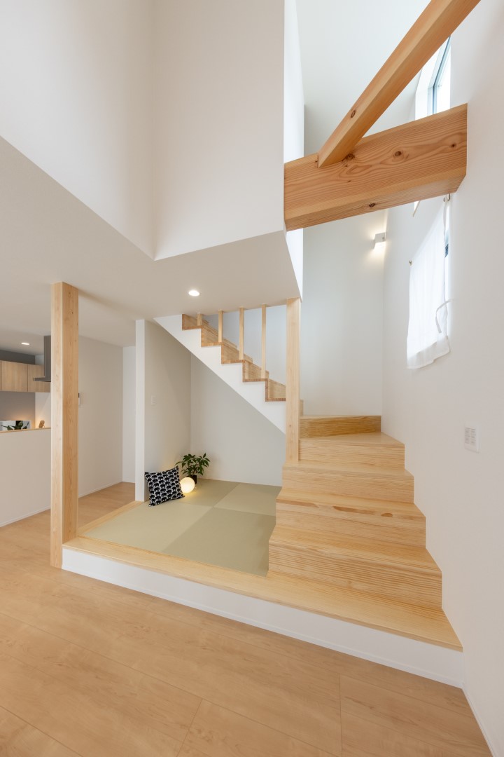 田原の閑静な住宅街に建つグレーのガルバリウムとホワイトの塗り壁を合わせた、シンプルモダンな外観の住まいです。柔らかなトーンで整えた室内は、家族の暮らしを優しく包む吹抜仕様の大空間。また一緒に暮らす愛猫が心地よく過ごせるよう、リビングには特製のキャットステップやペットドアも設置しています。毎日便利に使える畳コーナー、集中できる独立型の書斎も上手に取り入れ、デッドスペースのない快適な住空間が実現しました。