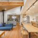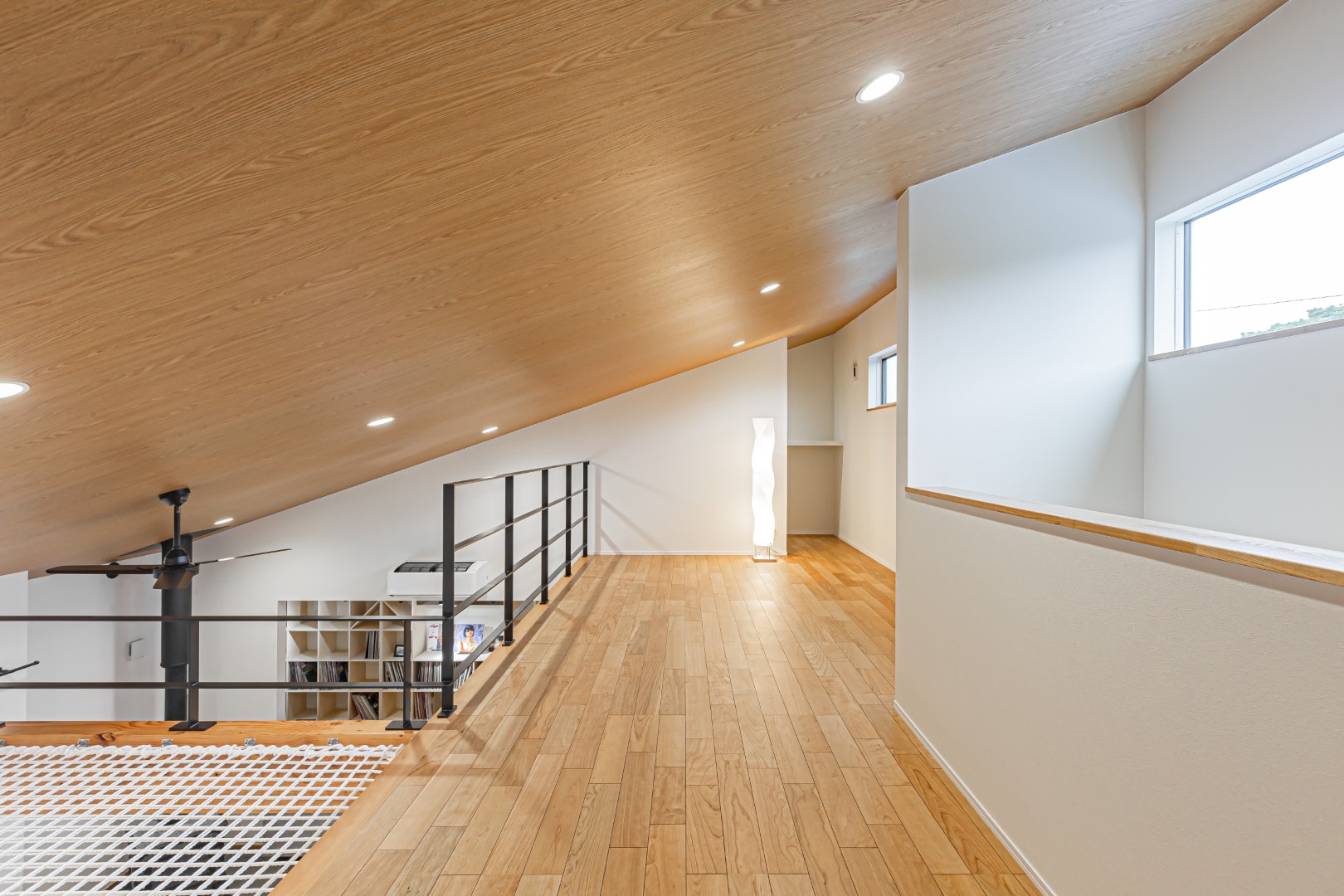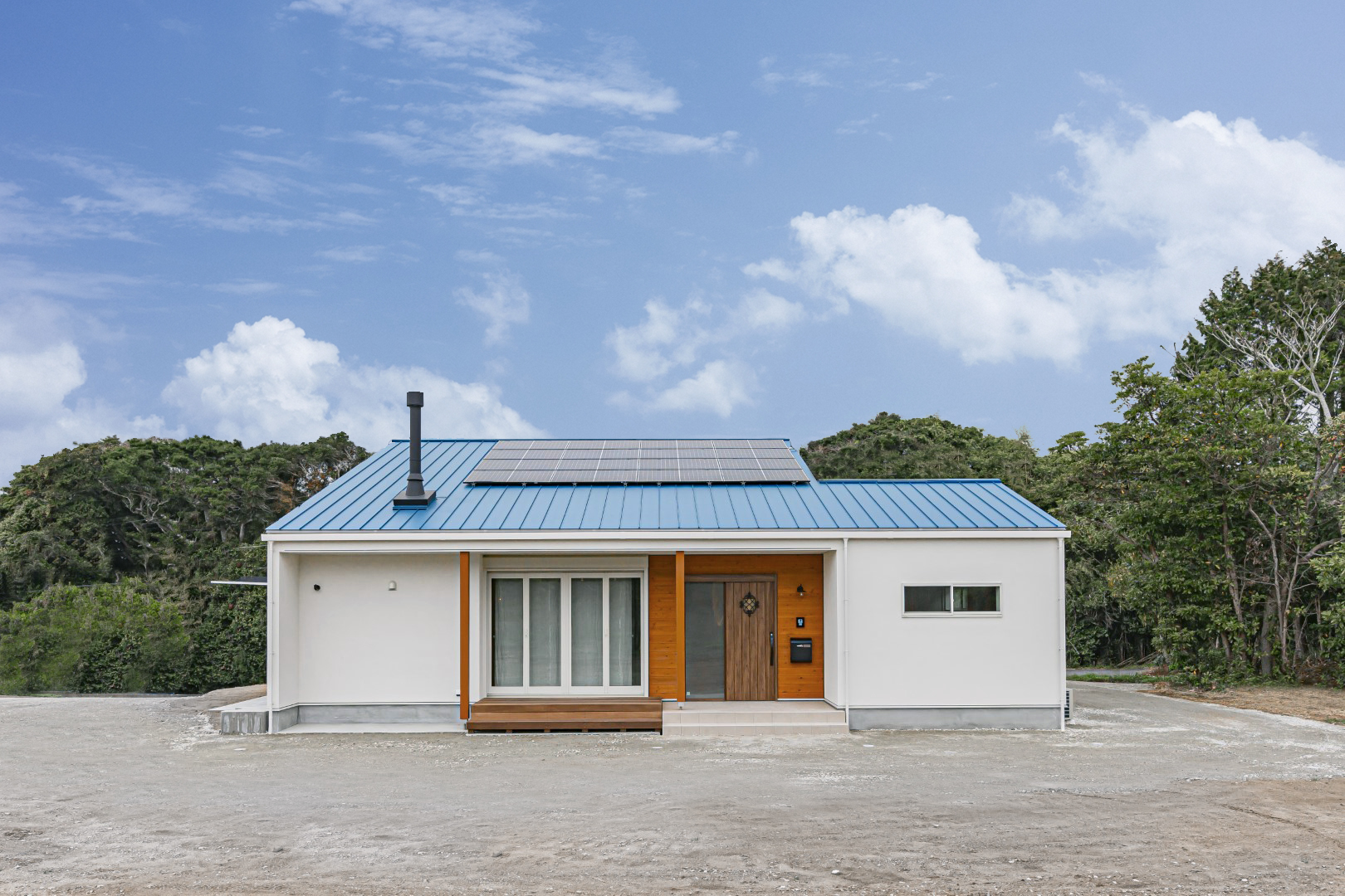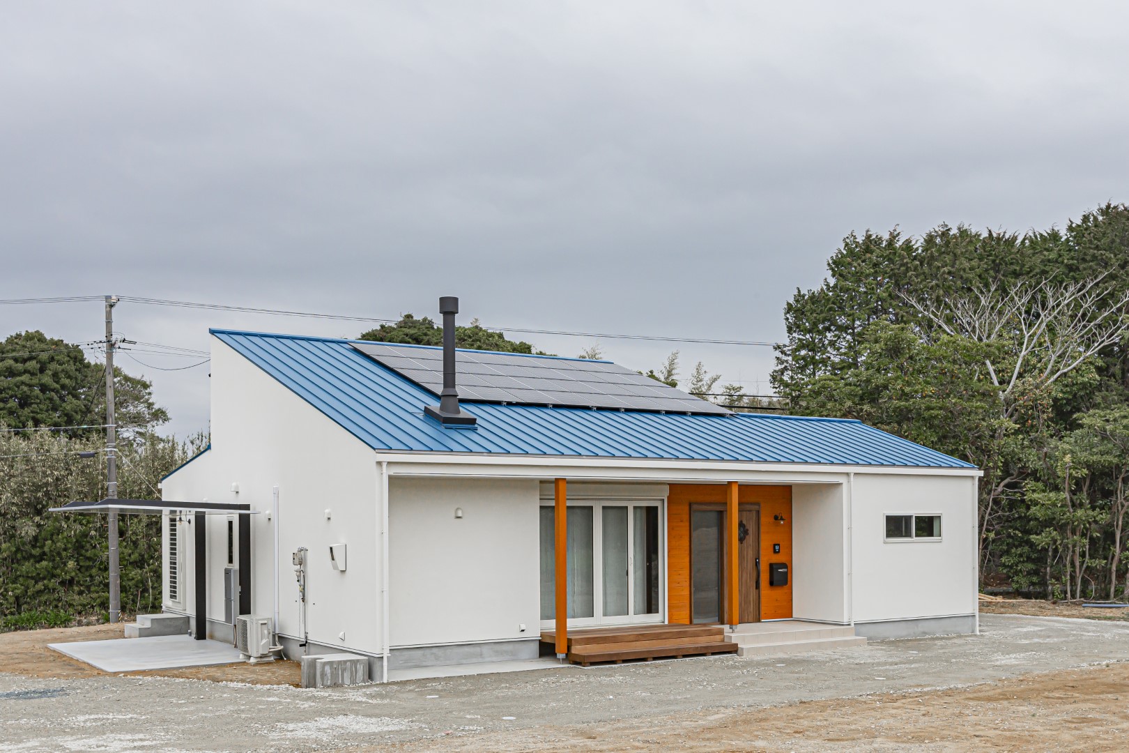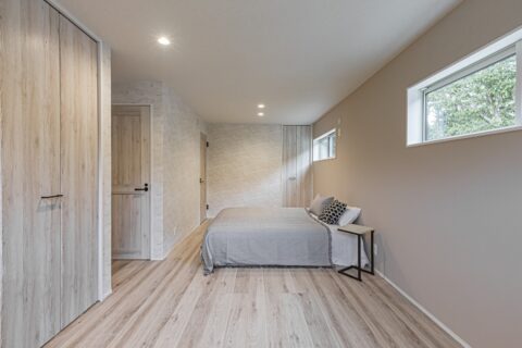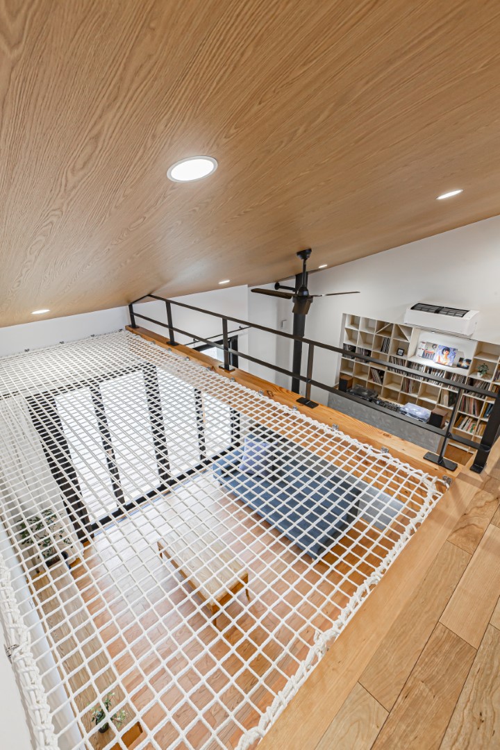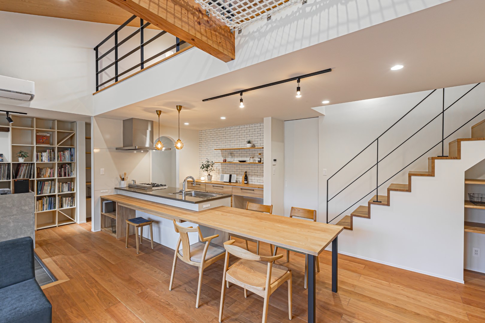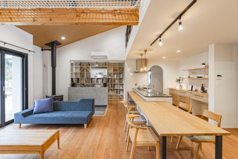 高松海岸に近い自然あふれる敷地を活かした、約40坪の平屋の住まい。壁一面のレコードラックや暖炉が印象的なLDKは、北欧シックなインテリアをイメージ。ブラックチェリーを使ったフロア材を採用し、個性あふれる大人の空間を演出しています。暮らしの中心になるオープンキッチンはカウンター素材からこだわった特注品。高天井を活かした吹抜空間にはアスレチックネットを張り込み、子どもも大人も心躍るプレイスペースになっています。