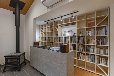 リビング内にはたってのご希望で、薪ストーブを組み込みました。木や炭でよごれやすいフロアは土間仕様だから安心です。ご主人の専用のDJブースには、オリジナルのカウンター&壁一面にレコードをぎっしり並べられるオープンラックを設置。お気に入りの1枚を飾ってライティングすることもできます。