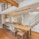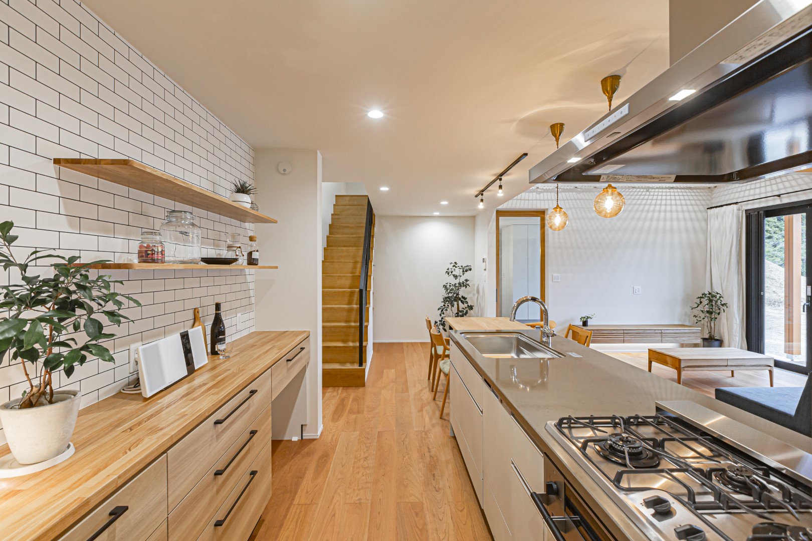 オープンラックを使った背面収納は、食器や小物を見せながら収納するのにぴったり。ワークカウンターはブラウンみあるクウォーツストーン製で、クールな印象もありながら、リビング全体にいきる木のあたたかな色調とも調和しています。