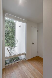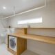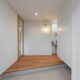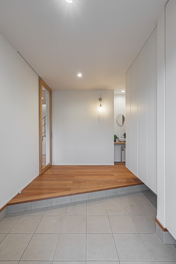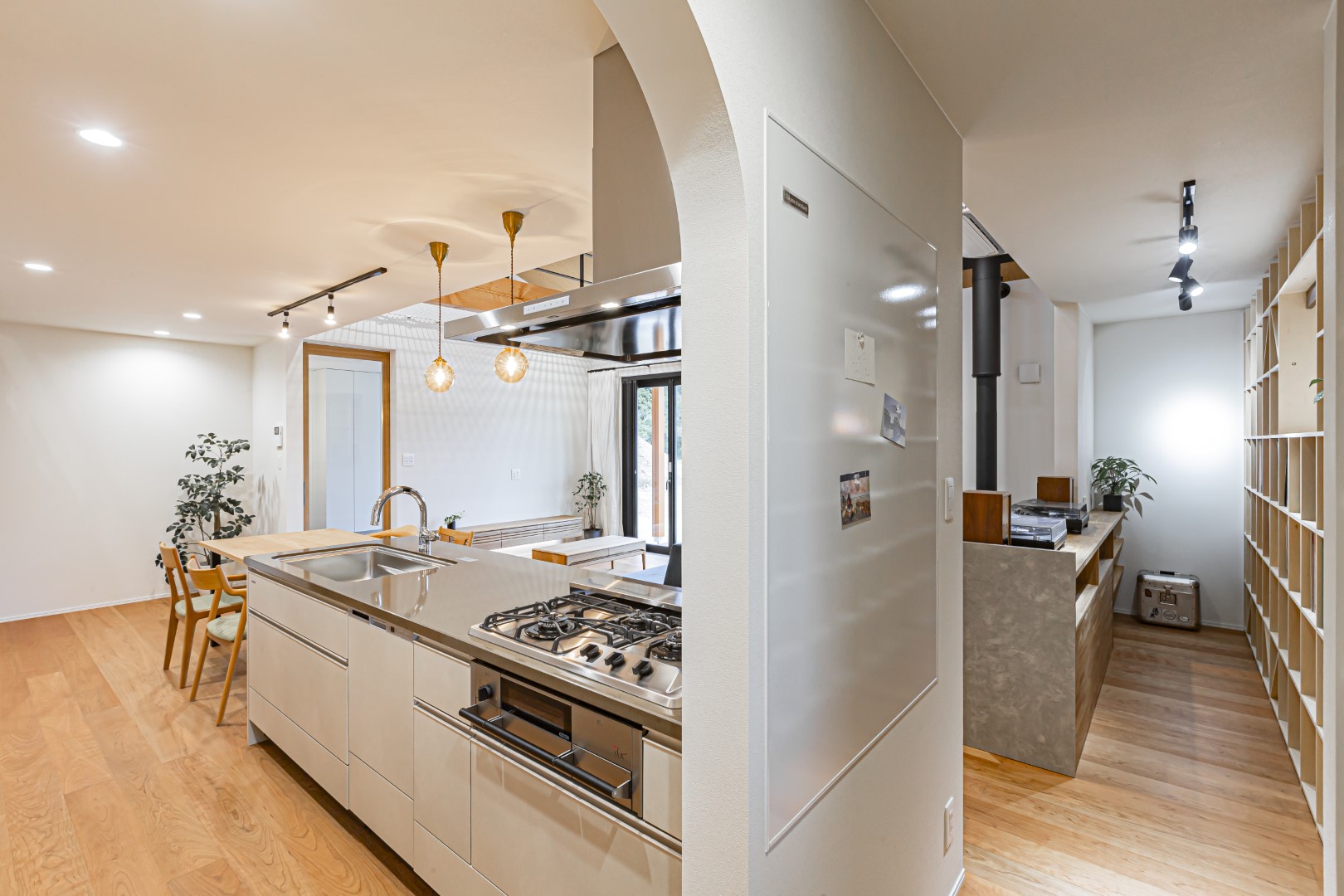 キッチンの横からDJブースにつながる回遊動線。この角の空間には冷蔵庫スペースとパントリー収納がレイアウトされています。キッチン横の壁はホーローパネルだから、市や学校のお知らせを貼ったりして便利に使えます。
