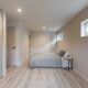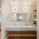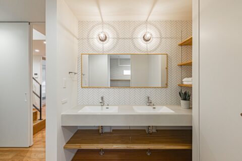 洗面化粧台は、大きなミラーに、水栓とボウルを2つ備えたダブル仕様。オープンラックとトール型のスリムCLも横づけしてあり、生活用品の収納場所にも困りません。壁付照明は真鍮色がレトロで美しいマリンランプを使っています。