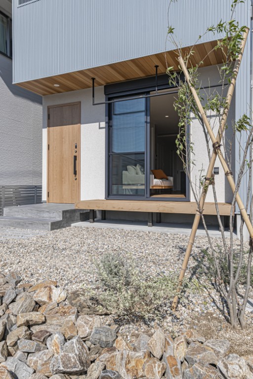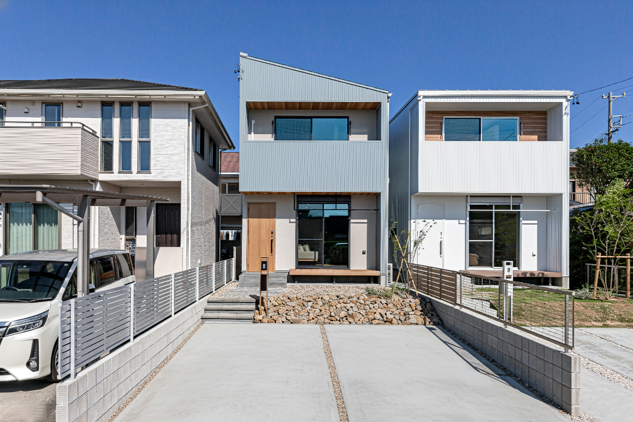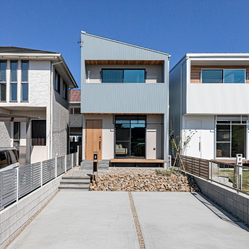 ・分譲住宅では珍しいガルバリウム鋼板×塗壁の外観