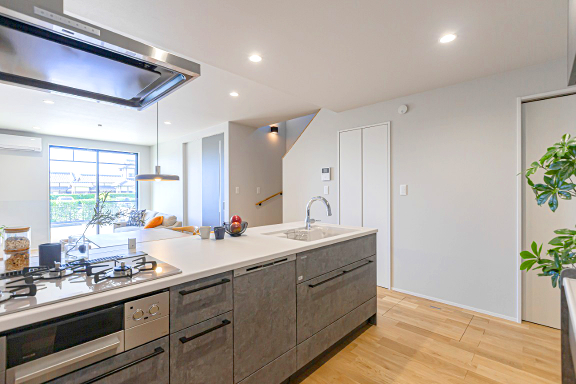 ・オープンキッチンは汚れにくいガラストップコンロ、タッチレス水栓付。デザイン性と実用性で◎